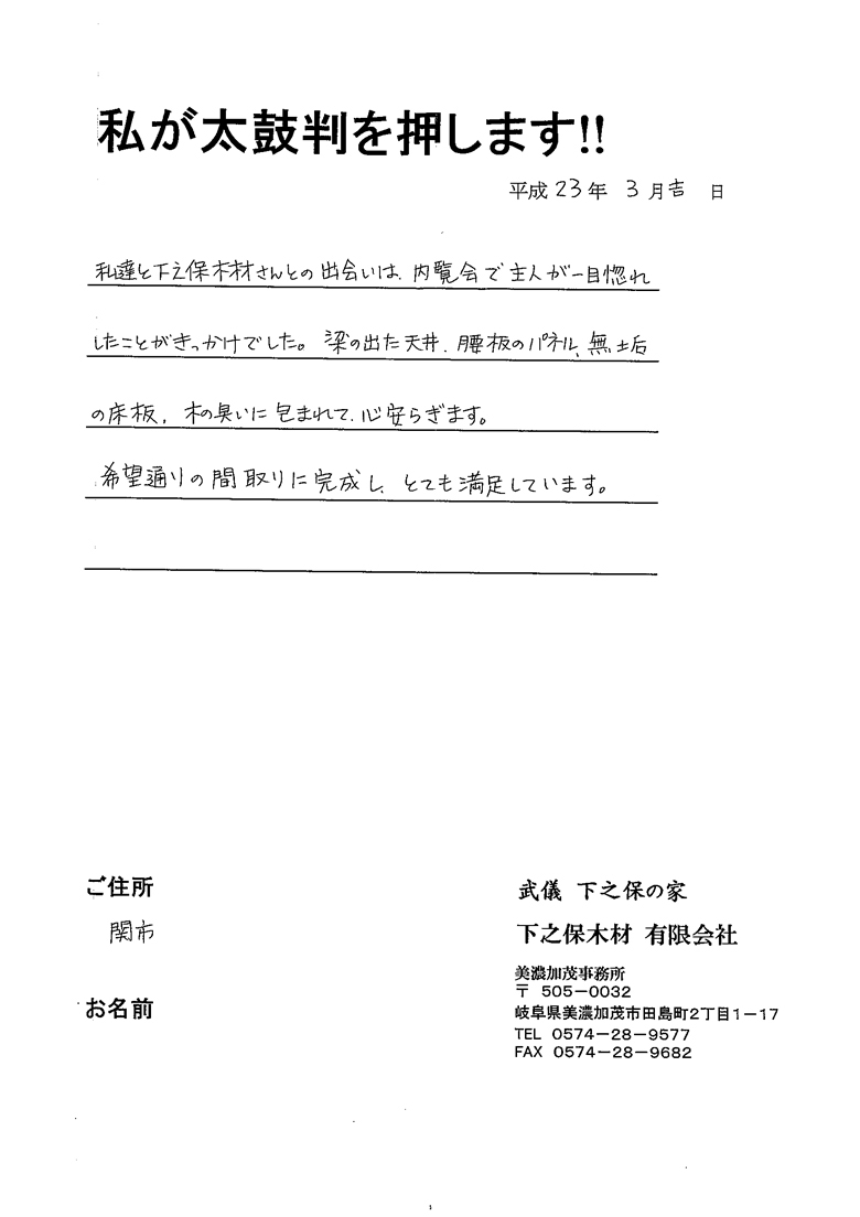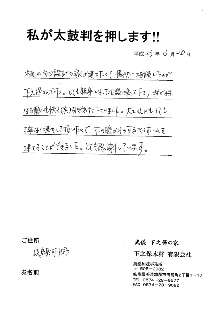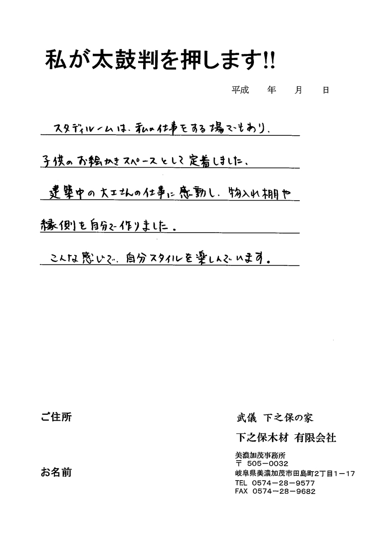 | 木造の自由設計の家が建てたくて、最初に相談したのが下之保さんでした。とても親身になって相談に乗って下さり、我がままなお願いも快く(笑)引き受けて下さいました。大工さんにもとても丁寧な仕事をして頂いたので、木の暖かみのするマイホームを建てることができました。とても感謝しています。 |
