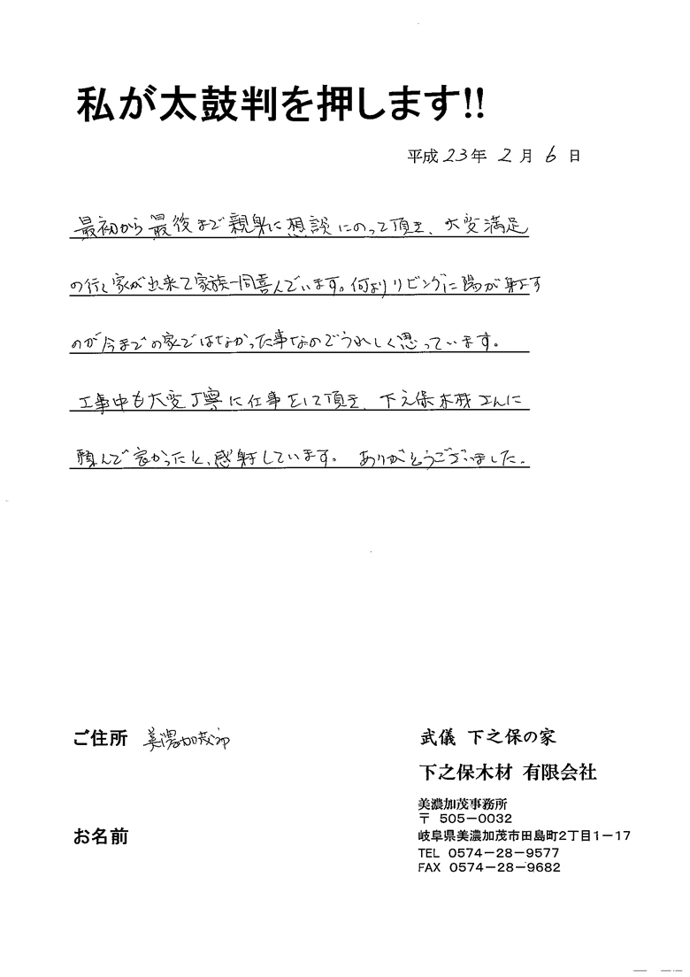 | 最初から最後まで親身に相談にのって頂き、大変満足の行く家が出来て家族一同喜んでいます。 何よりリビングに陽が射すのが今までの家ではなかった事なのでうれしく思っています。 工事中も大変丁寧に仕事をして頂き、下之保木材さんに頼んで良かったと、感謝しています。 ありがとうございました。 |