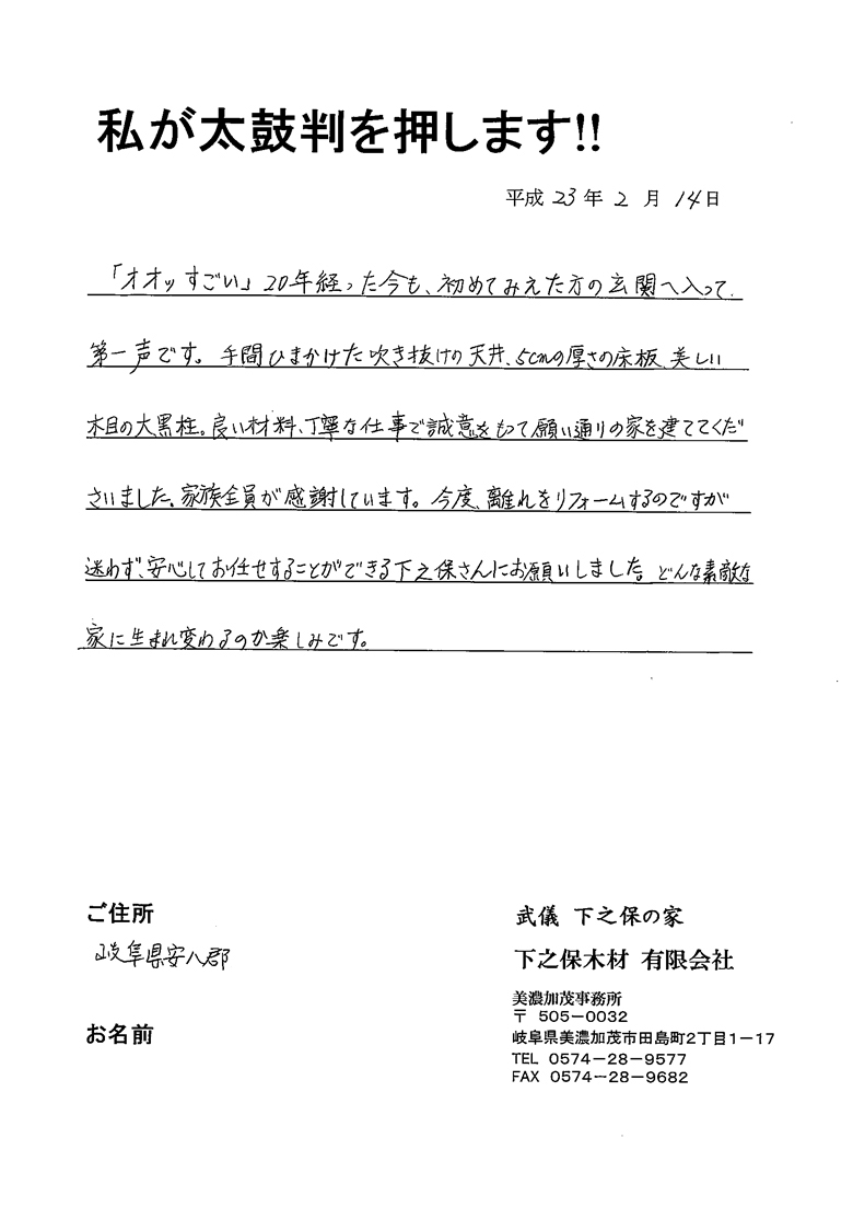 | 「オオッすごい」20年経った今も、初めてみえた方の玄関へ入って第一声です。手間ひまかけた吹き抜けの天井、5cmの厚さの床板、美しい木目の大黒柱。良い材料、丁寧な仕事で誠意をもって願い通りの家を建ててくださいました。家族全員が感謝しています。今度、離れをリフォームするのですが迷わず、安心してお任せすることができる下之保さんにお願いしました。どんな素敵な家に生まれ変わるのか楽しみです。 |