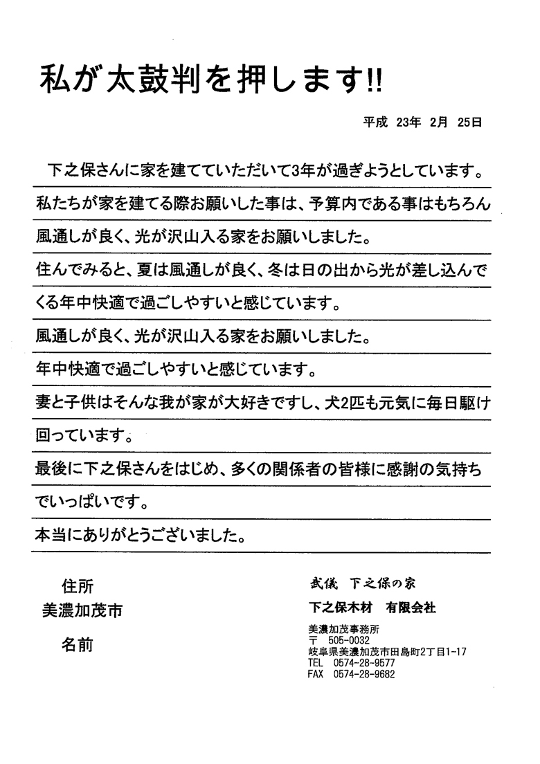| 下之保さんに家を建てていただいて3年が過ぎようとしています。私たちが家を建てる際お願いした事は、予算内である事はもちろん風通しが良く、光が沢山入る家をお願いしました。 住んでみると、夏は風通しが良く、冬は日の出から光が差し込んでくる年中快適で過ごしやすいと感じています。 妻と子供はそんな我が家が大好きですし、犬2匹とも元気に毎日駆け回っています。 最後に下之保さんをはじめ、多くの関係者の皆様に感謝の気持ちでいっぱいです。 本当にありがとうございました。 |